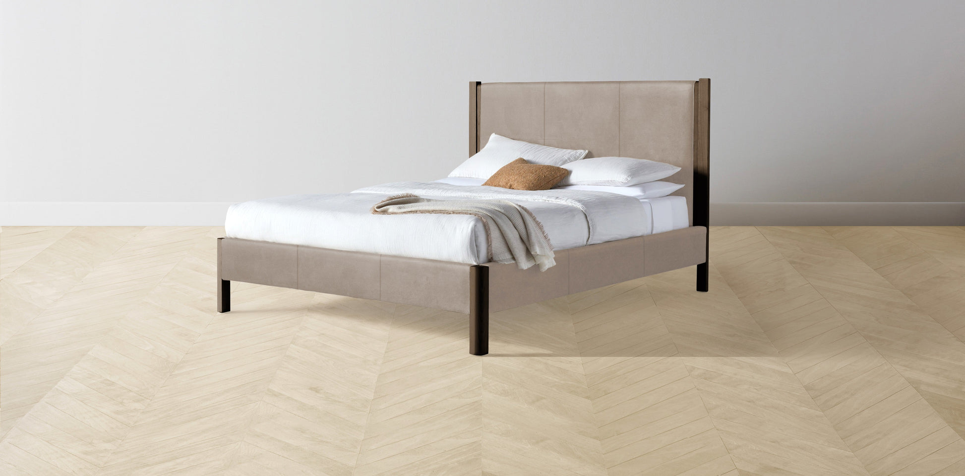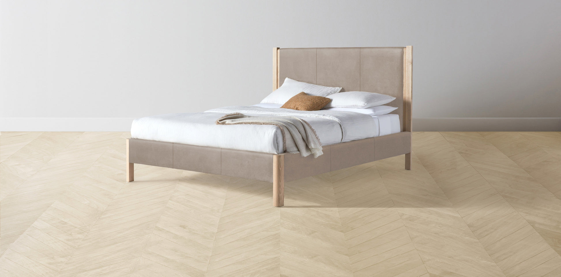 The Thompson - Nubuck Leather Fawn Bed - 48" Headboard - Upholstered on reverse